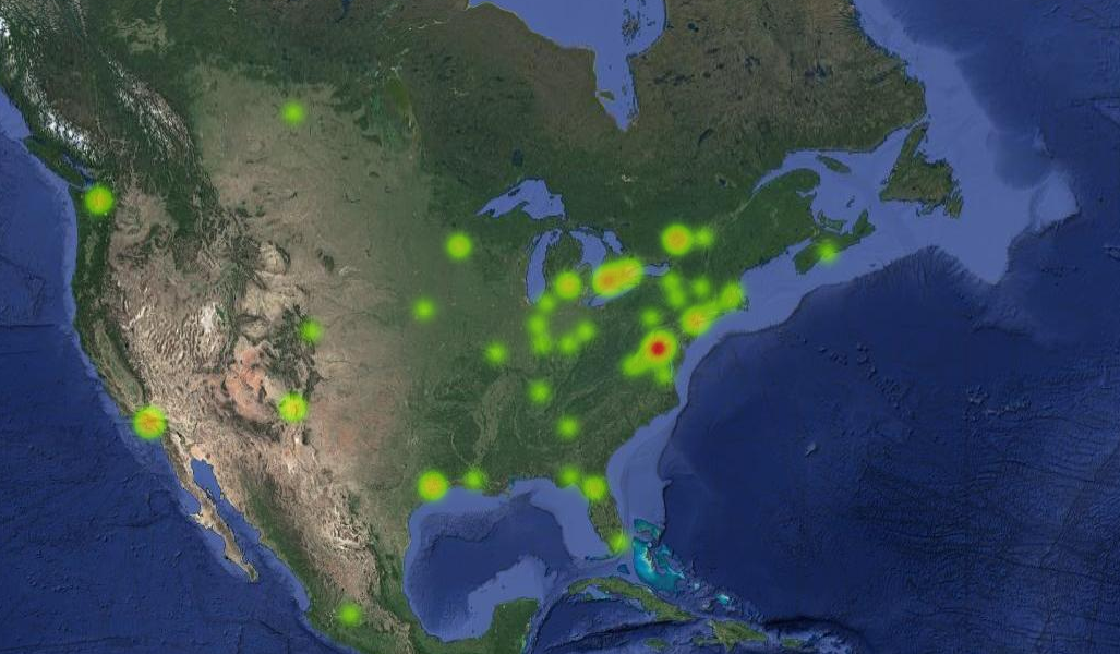 Heatmap of North American Contributors to The Programming Historian since launch. Map produced using Google Fusion Tables.